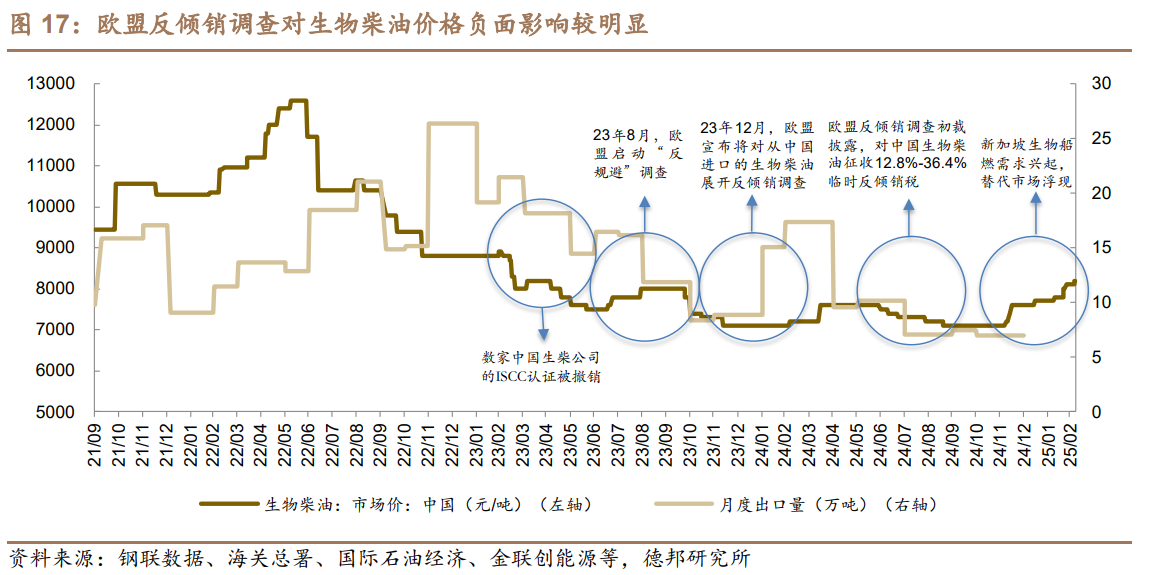 限于政策推广缓慢等因素永之胜,我国生物柴油主要以出口为主,欧盟是我国第一大出口区域,占比超过90%,因此我国生物柴油受到欧盟政策影响较大。具体而言,2023年12月20日,欧盟委员会对原产于中国的生物柴油发起反倾销调查。2024年8月16日,欧盟对中国生物柴油反倾销案作出初裁,初步裁定对涉案产品征收12.8%-36.4%的临时反倾销税。2025年2月11日,欧盟委员会发布公告,对原产于中国的生物柴油作出反倾销肯定性终裁,对怡斯莱集团(易高生物)征收10%反倾销税、对嘉澳环保征收35.6%反倾销税、对卓越新能征收23.4%反倾销税、对其他合作公司征收21.7%反倾销税、对其他公司征收35.6%反倾销税。根据德邦证券,调查期间,我国生物柴油行业出口业务经受巨大冲击,2024年出口量同比下滑43.0%,价格持续下滑。