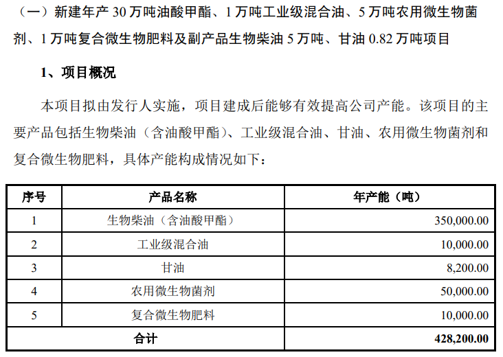 丰倍生物本次IPO拟募集10亿元,其中7.5亿元用于“新建年产30万吨油酸甲酯、1万吨工业级混合油、5万吨农用微生物菌剂、1万吨复合微生物肥料及副产品生物柴油5万吨、甘油0.82万吨项目”,该项目投资总额为10.4亿元。根据申报稿,该项目主要产能即为生物柴油(含油酸甲酯),年产能达到35万吨;然而,公司2023年度产能为10.5万吨,募投项目产能规模是现有规模的大约三倍。而从整个市场来看,2023年我国生物柴油名义产能约为326万吨,行业第一的卓越新能产能为50万吨,由此来看,丰倍生物的目的或为冲击行业领先地位。