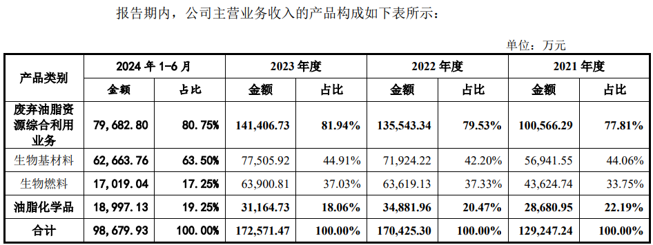 丰倍生物是一家废弃资源综合利用领域的企业,主要以废弃油脂生产资源化产品。公司主要产品为生物基材料和生物燃料,其中生物基材料主要为应用于农药、化肥、生物医药等多个领域的助剂;生物燃料主要为生物柴油;此外,公司还有油脂化学品业务,主要产品为DD油、脂肪酸等。